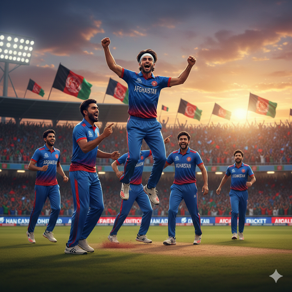 “A realistic digital illustration of Afghanistan cricket players celebrating a wicket against Pakistan in Sharjah stadium. The players are wearing blue ODI jerseys, jumping in joy with clenched fists. In the background, a packed stadium with passionate fans waving Afghanistan flags. The evening sky has a golden sunset. Cinematic lighting, sports photography style, ultra-detailed, no text or logos, suitable for a cricket blog.”